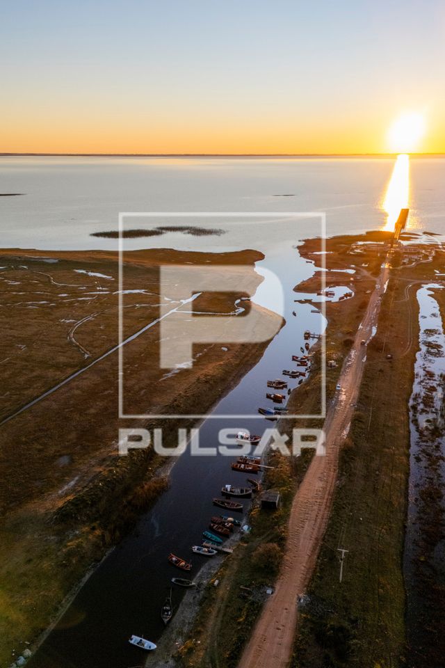 Palavras-chave: aérea ancoradouro barcos brilho do sol colônia de pescadores crepúsculo horizonte lacustre pesca artesanal píer pôr do sol porto reflexo ecossistema costeiro lusco fusco fim de tarde natureza região sul colônia de pesca aéreo economia Lagoa Mirim vista de drone ancorados portuaria