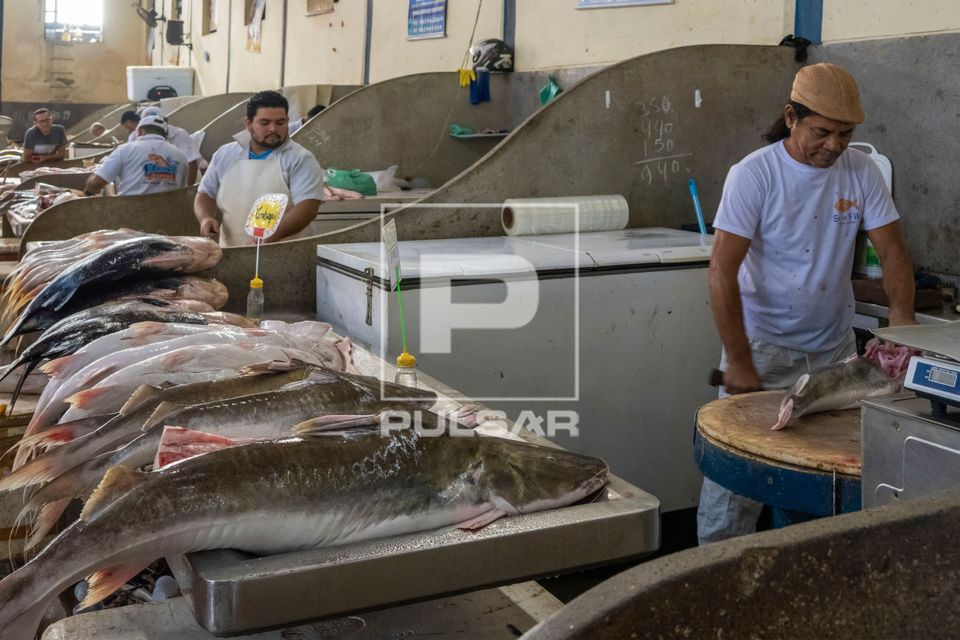 Palavras-chave: balcão banca comércio mercado peixaria peixes trabalho região norte pescados economia box trabalhadores vista interna