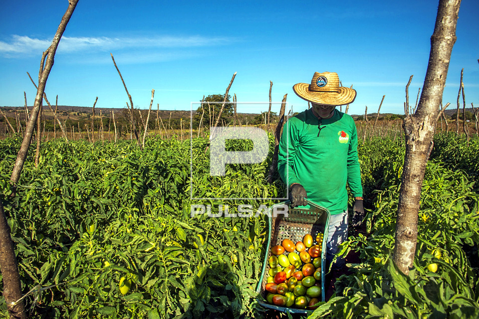 Palavras-chave: agricultura colheita manual plantação tomates frutas frutos região nordeste trabalho trabalhador rural envarado caixa caixote
