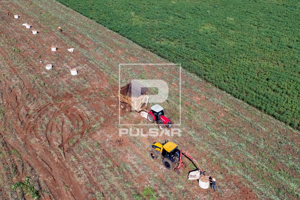 Palavras-chave: agricultura colheita manual plantação saco trator zona rural vista de cima região centro-oeste colhendo mandioca macaxeira aipim mandiocal big bag vista de drone