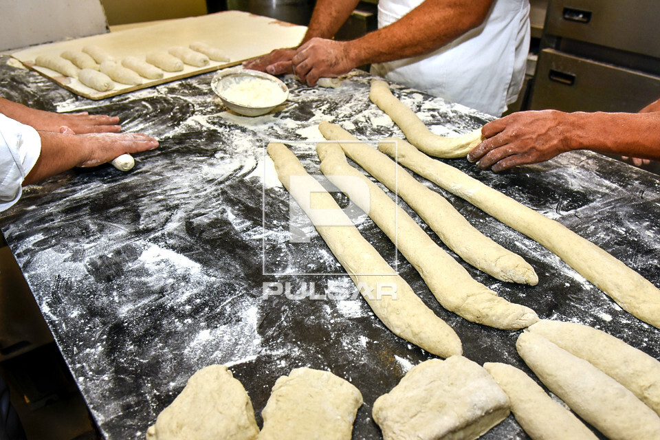 Palavras-chave: alimento baguetes bancada bandeja cozinha industrial culinária farinha gastronomia manual massa mãos padaria padeiros panificação pessoas preparando preparo produtos produção profissão pães pão quantidade região sudeste salgado semelhante semelhança serviços tabuleiro trabalhadores trabalhando trabalho vista interna massas crua baguete francesa