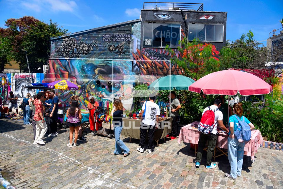 Palavras-chave: bairro cultura grafitagem grafite pedestre pintura ponto turístico região sudeste arte de rua vila madalena beco do batman beco do grafite desenho turismo lazer turistas pessoas feira guarda-sol população economia venda comércio